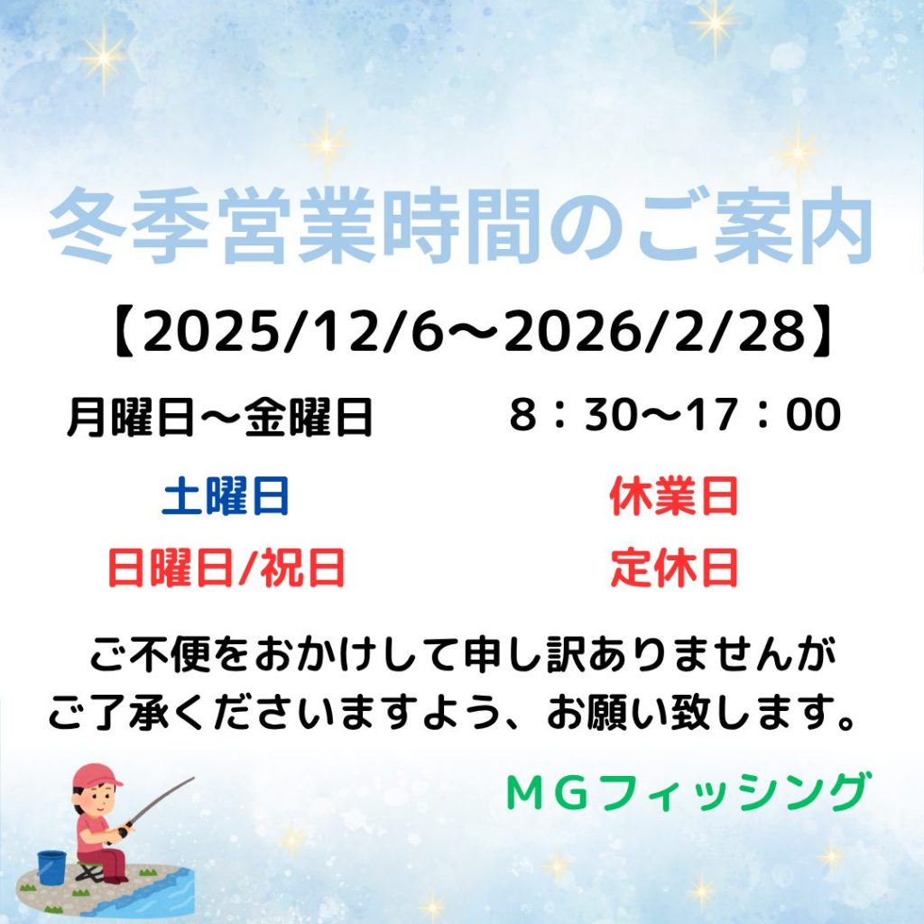 【冬季営業時間のお知らせ】 いつもMGフィッシングをご利用頂きありがとうございます😊 当店は下記の通り冬季の間、営業時間を変更して営業させていただきます☃️ ❄️【冬季営業時間】❄️ 2025年12月6日~2026年2月28日 【月曜~金曜日】   8:30~17:00 【土曜日】      休業日 【日曜日・祝日】   定休日 ご迷惑をお掛け致しますがご理解頂きますようお願い申し上げます🙇‍♀️